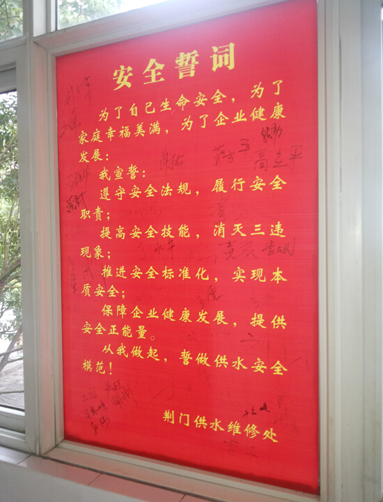 維修處維修工作點(diǎn)多面廣,施工環(huán)境日益復(fù)雜,安全生產(chǎn)形勢(shì)面臨嚴(yán)峻挑戰(zhàn)。抓好安全生產(chǎn)各項(xiàng)工作是維修處一直常抓不懈的一項(xiàng)重要工作,而探討不拘一格的安全生產(chǎn)管理模式和多渠道、多形式的全員安全教育培訓(xùn)方式也一直是維修處創(chuàng)新安全管理方式、適應(yīng)安全管理新常態(tài)的重要舉措。全員安全宣誓是我處今年安全生產(chǎn)月的一大亮點(diǎn),全體人員由處領(lǐng)導(dǎo)帶隊(duì)在宣誓墻下莊嚴(yán)宣誓:“為了自己生命安全,為了家庭幸福美滿(mǎn),為了企業(yè)健康發(fā)展,我宣誓……從我做起,誓做供水安全模范!”