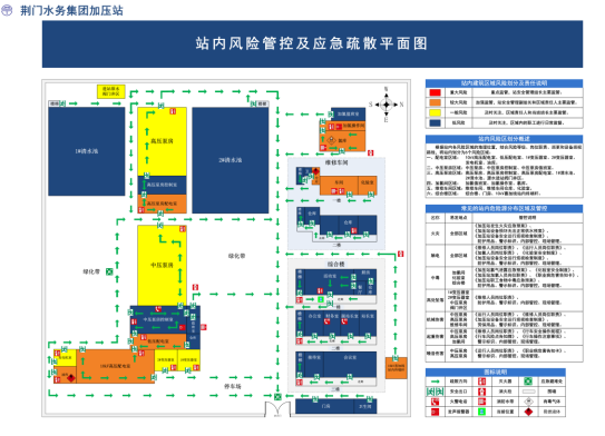 加壓站在站內全面推行安全風險分級管控和隱患排查治理雙重預防機制,對作業(yè)現(xiàn)場可能存在的安全風險進行全面識別、評估和分級,同時制作風險四色圖和風險告知牌,將安全風險等級從高到低按區(qū)域依次劃分為重大、較大、一般和低風險,分別用紅、橙、黃、藍四種顏色標示,明確不同區(qū)域的風險等級、防范措施和相關責任人,以最直觀的方式展示作業(yè)現(xiàn)場的安全風險及防范措施。根據風險四色圖和風險告知牌外來人員能了解所處區(qū)域可能存在的風險,做好自身防護,施工人員則可以做好施工前的風險管控,降低作業(yè)過程中的安全風險。