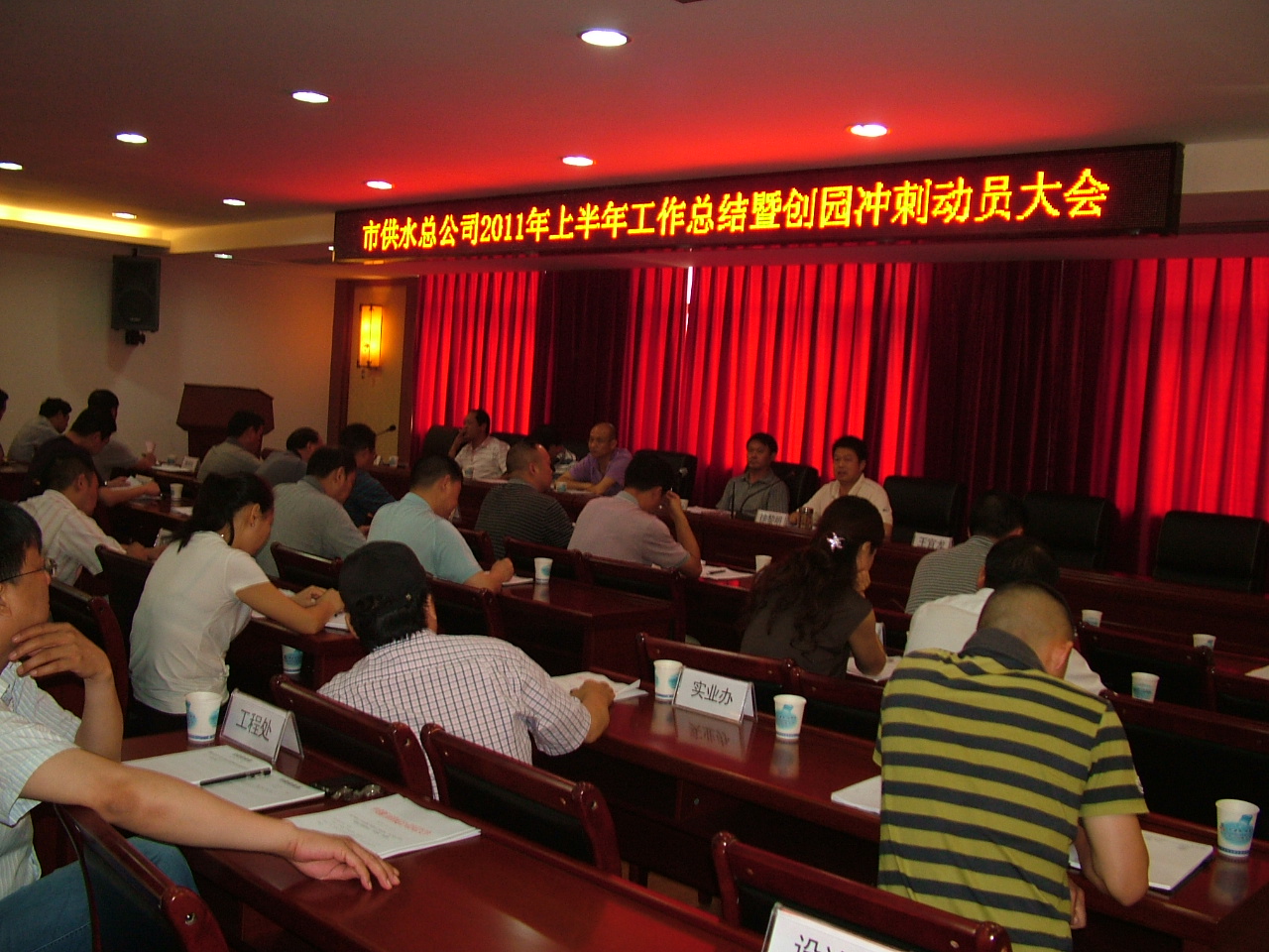 7月6日,市供水總公司在六樓會議室召開2011年上半年工作總結(jié)暨創(chuàng)園沖刺動員大會。公司中層以上干部和全體機(jī)關(guān)人員參加會議,會議由黨委書記、副總經(jīng)理陳永根主持,會議內(nèi)容豐富而緊湊。黨群辦主任馬兆芳傳達(dá)了住建委創(chuàng)園沖刺動員大會精神;陳書記部署了創(chuàng)建國家園林城市工作和人大評議工作;副總經(jīng)理郭林舫部署了安全生產(chǎn)工作;黨委副書記、工會主席徐黎明傳達(dá)了綜合整治會議精神;總經(jīng)理陳衛(wèi)國對上半年工作作了總結(jié),對下半年工作作了安排,傳達(dá)了市委從嚴(yán)管理干部的意見精神,對公司創(chuàng)優(yōu)發(fā)展環(huán)境,整治“庸懶散”專項(xiàng)治理活動進(jìn)行了動員安排,要求全體干部職工提振精神、腳踏實(shí)地、創(chuàng)先爭優(yōu)、統(tǒng)籌兼顧,為出色完成全年目標(biāo)任務(wù)和各項(xiàng)重點(diǎn)工作,推動供水工作上新臺階而努力奮斗!