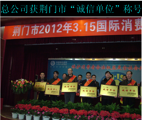 3.15國際消費(fèi)日前夕,在荊門市開展的“萬名消費(fèi)者評誠信”活動中,經(jīng)過廣大消費(fèi)者投票評選,荊門市供水總公司被市文明委、市工商行政管理局、市消委聯(lián)合授予“誠信單位”,并取得第三名的好成績。圖為黨委書記陳永根在表彰會上接受牌匾。