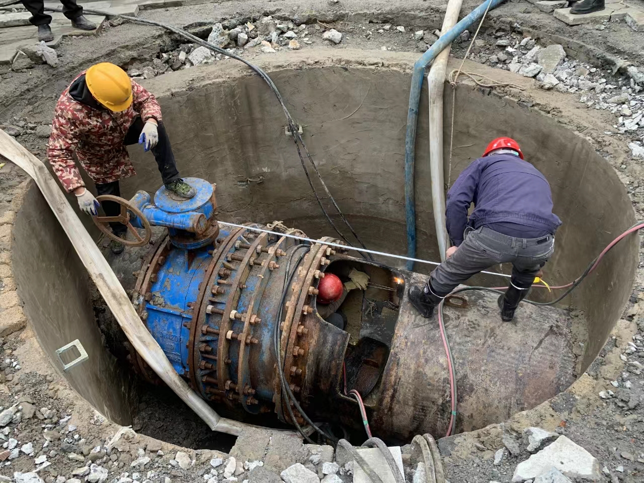 26日8時(shí),吊車已將直徑3米5的井蓋移至一旁,開始緊張有序的施工作業(yè)。搶修人員將DN1200管道切割成俗稱“開天窗”的長方形,3臺(tái)泵抽水6.5小時(shí),才將管道內(nèi)3400噸水排空。