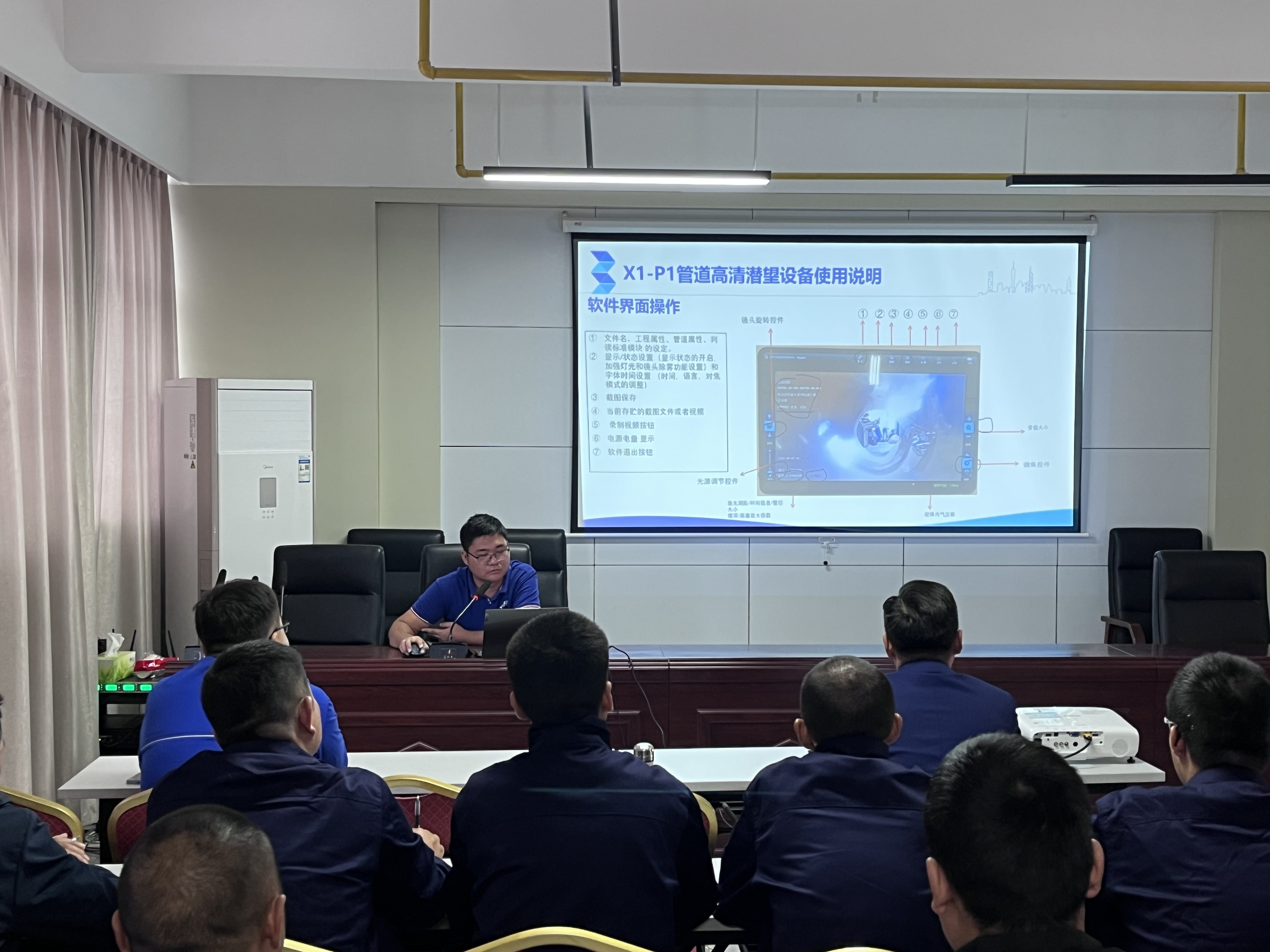 本次培訓(xùn)采用“理論+實(shí)操”相結(jié)合模式。理論授課環(huán)節(jié),授課老師圍繞CCTV管道檢測機(jī)器人工作原理、設(shè)備結(jié)構(gòu)組成、操作規(guī)范及安全注意事項等內(nèi)容,通過PPT展示和應(yīng)用案例開展系統(tǒng)授課。參訓(xùn)員工全神貫注,詳細(xì)記錄操作要點(diǎn),積極與老師互動交流,對這位“新伙伴”有了初步的理論認(rèn)知。