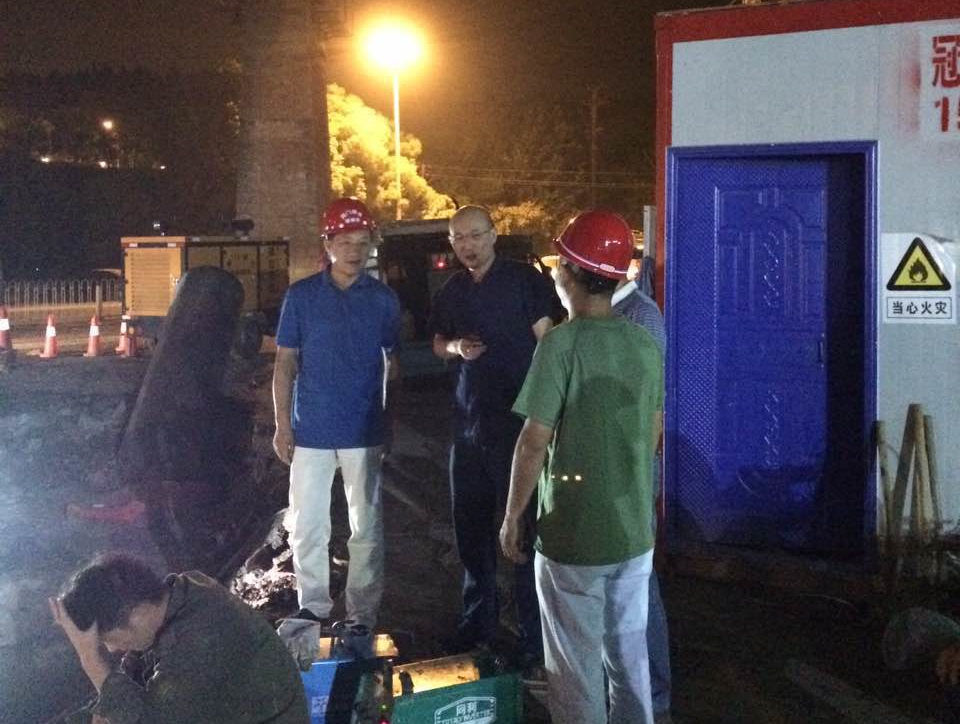 此次施工任務(wù)重、時(shí)間緊、戰(zhàn)線長、交叉作業(yè)多、未知因素多,市供水總公司科學(xué)組織、準(zhǔn)備充分、措施有力,創(chuàng)造了荊門供水單次停水施工碰頭數(shù)量最多、停水時(shí)間最短的歷史紀(jì)錄!此次施工前,市供水總公司審時(shí)度勢,啟動了應(yīng)急預(yù)案,從人員、物資、設(shè)備、應(yīng)急搶險(xiǎn)等各方面都做了充分準(zhǔn)備。當(dāng)晚,公司黨委書記、總經(jīng)理陳永根親臨施工現(xiàn)場,坐鎮(zhèn)一線指揮,要求相關(guān)部門集中力量,全力配合,爭取在最短的時(shí)間內(nèi)完成施工,盡快恢復(fù)供水。在爭分奪秒的施工過程中,全體參戰(zhàn)單位和人員在總公司領(lǐng)導(dǎo)正確指揮下,發(fā)揚(yáng)"特別能吃苦、特別能戰(zhàn)斗、特別能奉獻(xiàn)"的“供水鐵軍”精神,團(tuán)結(jié)一心,眾志成城,密切配合,群策群力,譜寫了供水人敢與時(shí)間賽跑、敢同困難較勁的“合奏曲”。維修公司、安裝公司、營抄中心工作人員作為搶修主力軍,在悶熱的坑洞下和污濁的泥水中實(shí)行分班作業(yè)、輪流施工,艱苦作業(yè)。職能部門管網(wǎng)運(yùn)維部、工程管理部、客服中心、水質(zhì)檢測公司積極發(fā)揮統(tǒng)籌協(xié)調(diào)能力,調(diào)度應(yīng)急供水車緊急供水、調(diào)配管材物質(zhì)、快速水質(zhì)化驗(yàn)……竭盡全力地為DN1000管道碰頭施工保駕護(hù)航。