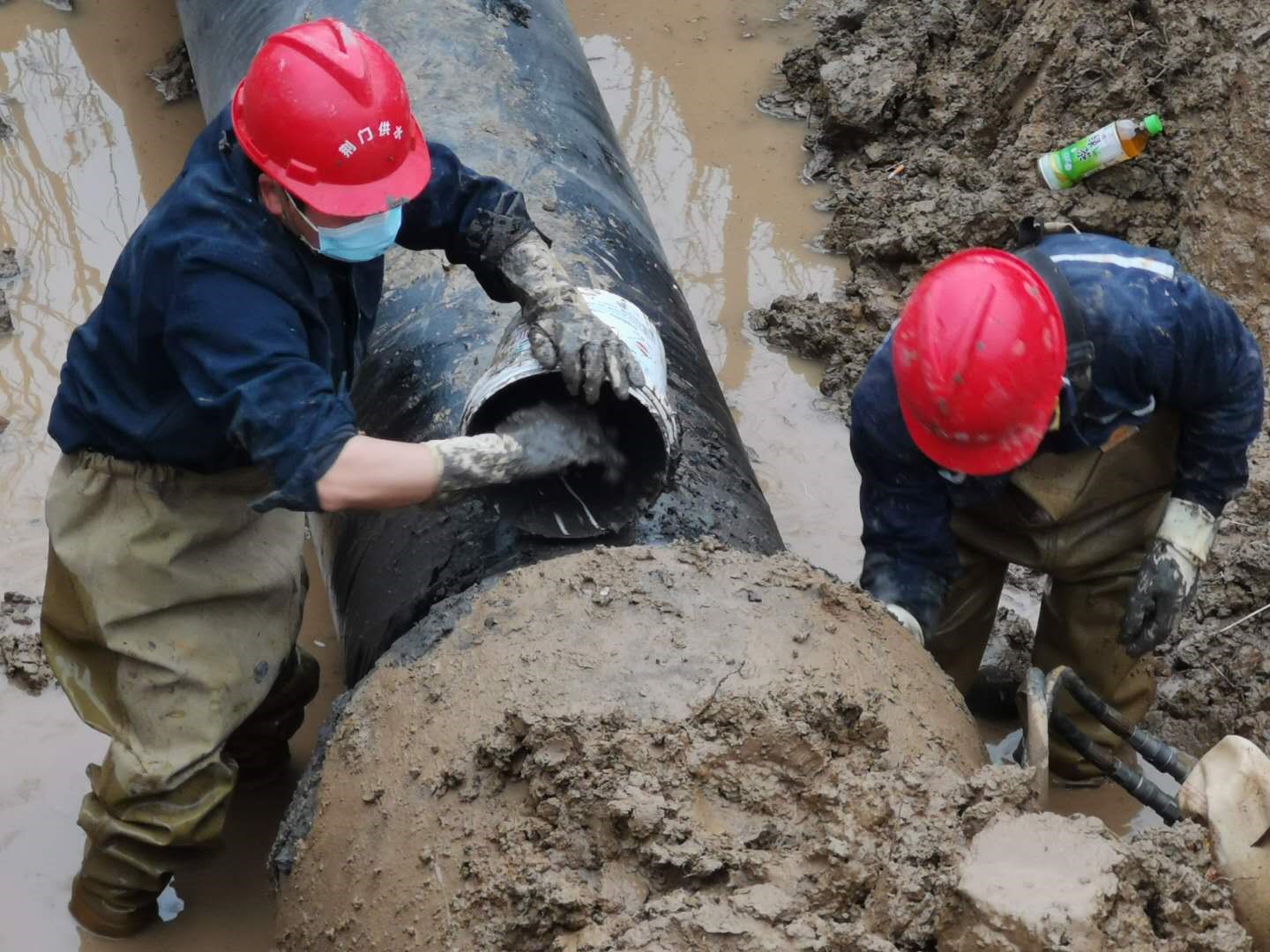 22310時,掇刀區(qū)迎春大道人福藥業(yè)門前DN600mm主供水管道突發(fā)爆管,供水維修部門迅速啟動疫情期間應(yīng)急搶修預案,組織人員、工程機械、維修設(shè)備趕赴現(xiàn)場,經(jīng)過9個多小時的緊張搶修,于當日晚742分恢復了供水。緊接著次日8點,東寶區(qū)科陽路DN600mm主供水管道突發(fā)爆管,巡查人員現(xiàn)場核實后迅速止水,并及時通告用戶停水信息后開始倒閘排水,到13時左右開挖出爆管的DN600的主供水管道出現(xiàn)在大家面前,相比前日的搶修,整段水管因裂口較大損壞嚴重,不能簡單修復,只能現(xiàn)場立即制定可靠的管道更換維修方案。當時,全部工作人員從早上到現(xiàn)場已經(jīng)工作了5個小時,滴水未進,但大家為保障搶修進度,仍然堅持一邊加班加點對基坑進行處理,一鼓作氣將破損管道清理出來,做好對接管道的清淤工作。另一邊搬運快干水泥,切割、加工、運輸、吊裝管道,1435分把全部材料物資運抵現(xiàn)場開始作業(yè)。隨后,大家在泥地里匆匆啃了幾口方便面后,又投入到緊張的搶修工作中,終于在1817分完成了維修,待水泥養(yǎng)護好后,于2127分通水,及時保障了科陽路企業(yè)和周邊居民的正常生產(chǎn)生活用水。